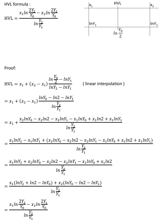 半值層(HVL)計算公式推導 公式中的代數註解: HVL : 半值層 Y0 : 未加阻擋物(一般為鋁片)時的曝露量(R 或 Gy) Y1 : 加上厚度為X1之阻擋物時的曝露量 (Y1 < Y0 / 2) Y2 : 加上厚度為X2之阻擋物時的曝露量 (Y2 > Y0 / 2)